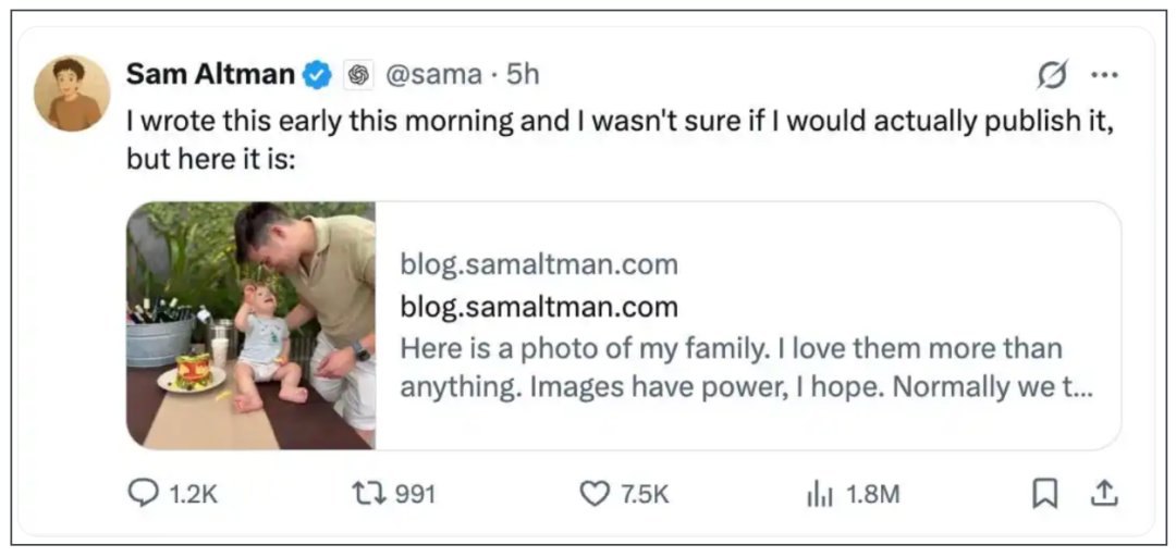 事后,奥特曼在其个人博客上发布了一张家人照片,写道,“ 我希望图片是有力量的…… 希望能打消下一个向我家扔燃烧瓶的念头,不管他们对我有什么看法。”