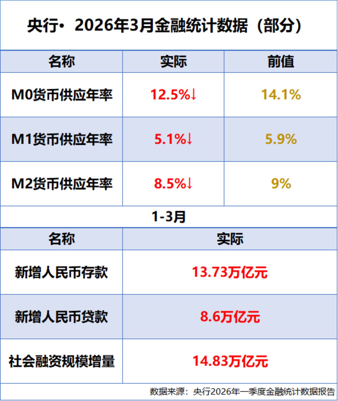 央行 2026 年 3 月重要金融数据一览:M2 同比增长 8.5%,一季度社融规模增量累计为 14.83 万亿元