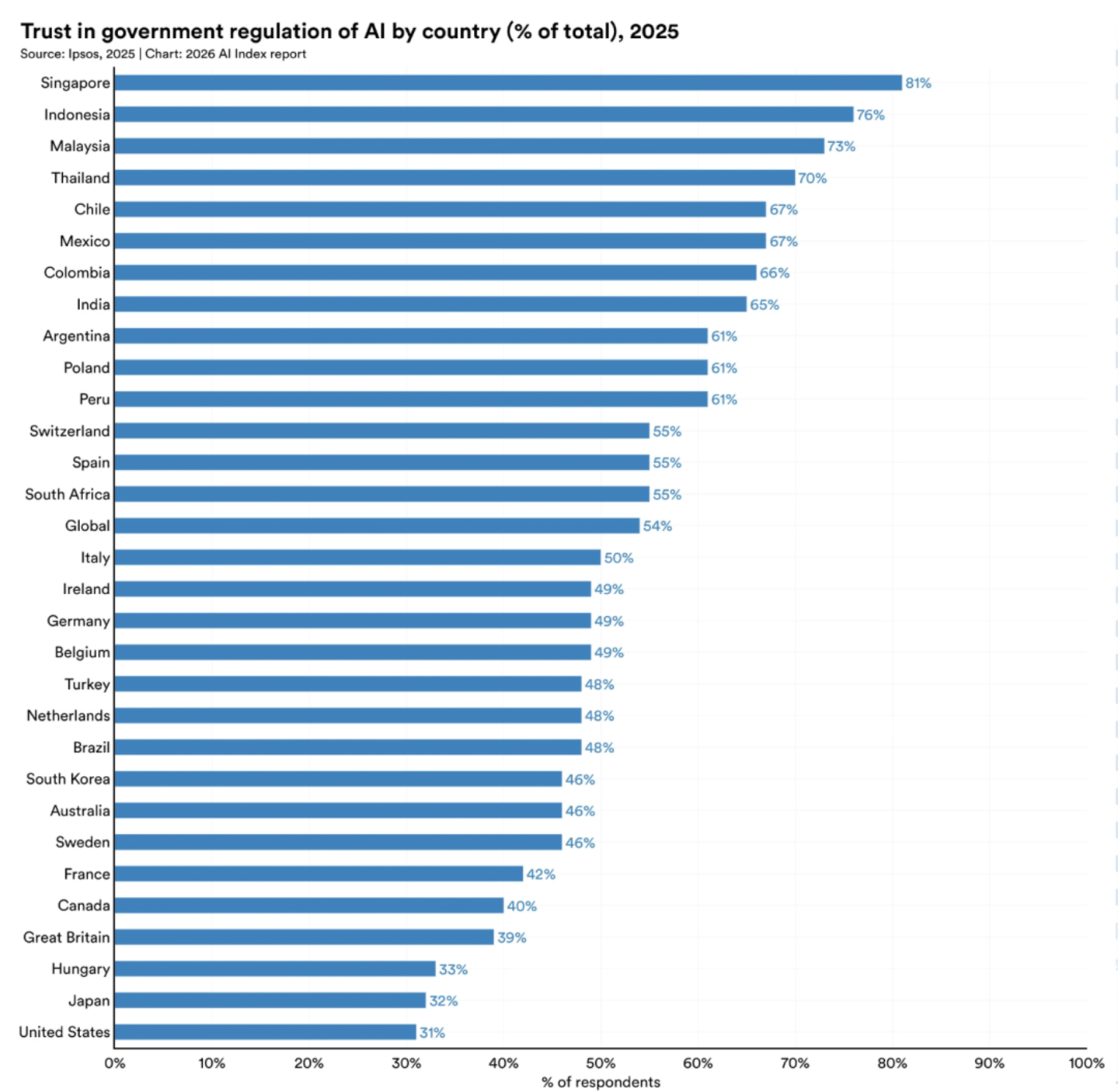报告指出,在受访国家中,美国民众对其政府监管 AI 能力的信任度最低,仅为 31%。在全球范围内,欧盟在有效监管 AI 方面,比美国或中国更高一些。