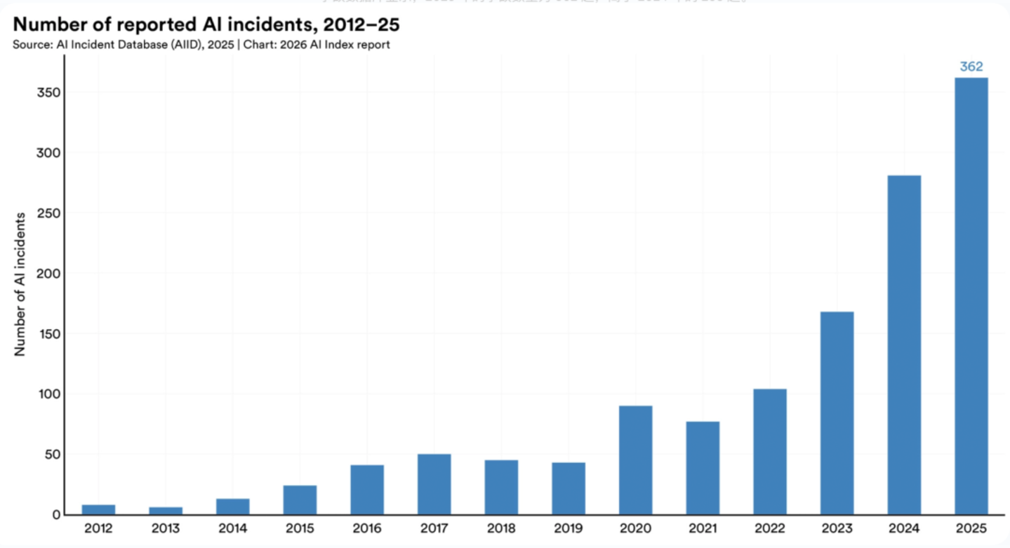 如今,几乎所有领先的前沿模型开发商都会报告其在 MMLU 和 SWE-bench 等能力基准测试中的结果,但关于负责任的 AI 基准测试的报告仍然很少。有记录的 AI 事故持续上升,AI 事故数据库显示,2025 年的事故数量为 362 起,高于 2024 年的 233 起。