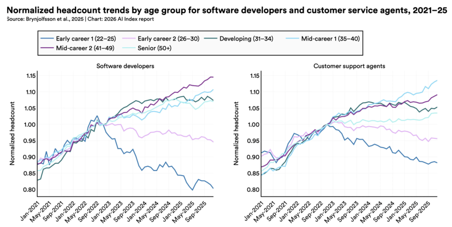 斯坦福大学经济学家在 2025 年的一项研究中指出,自 2022 年以来,22 至 25 岁软件开发人员的就业率下降了近 20%。