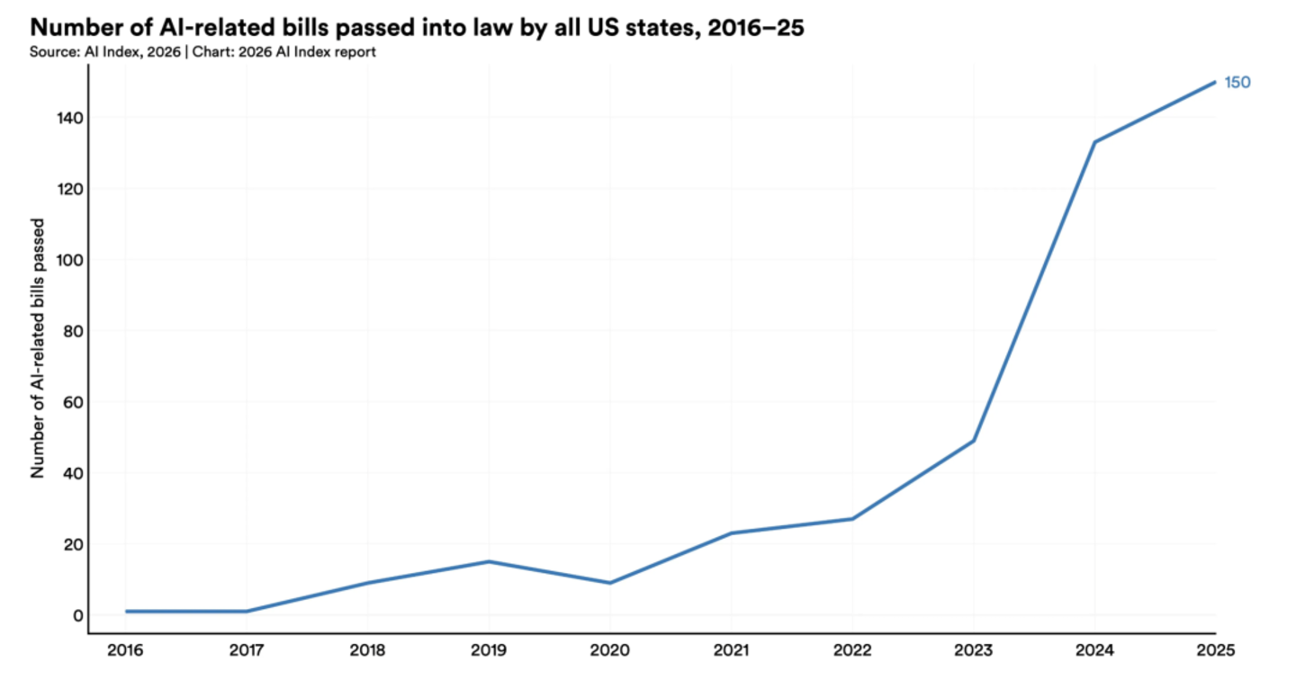 尽管美国采取了上述行动,但美国各州议会仍通过了创纪录的 150 项人工智能相关法案。