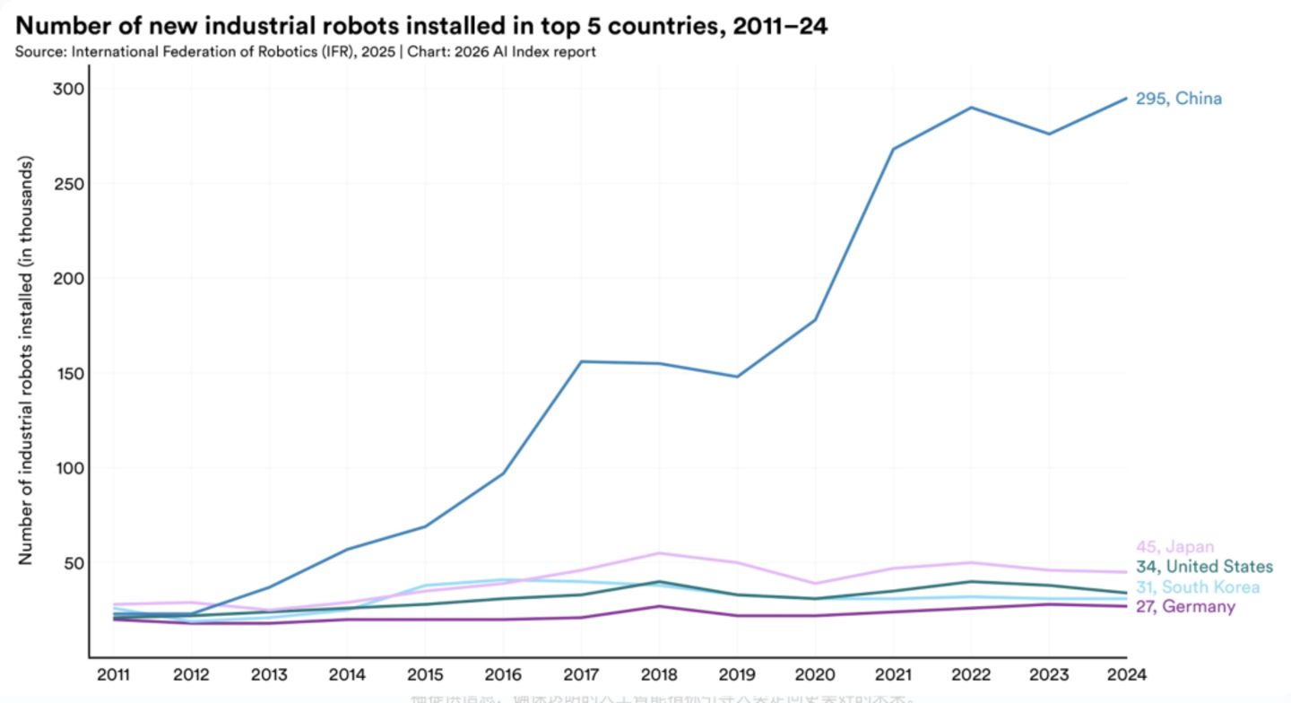 排名前 5 位的国家新安装的工业机器人数量中,中国机器人企业以 295 项排名第一,远超过日本、美国、韩国等。