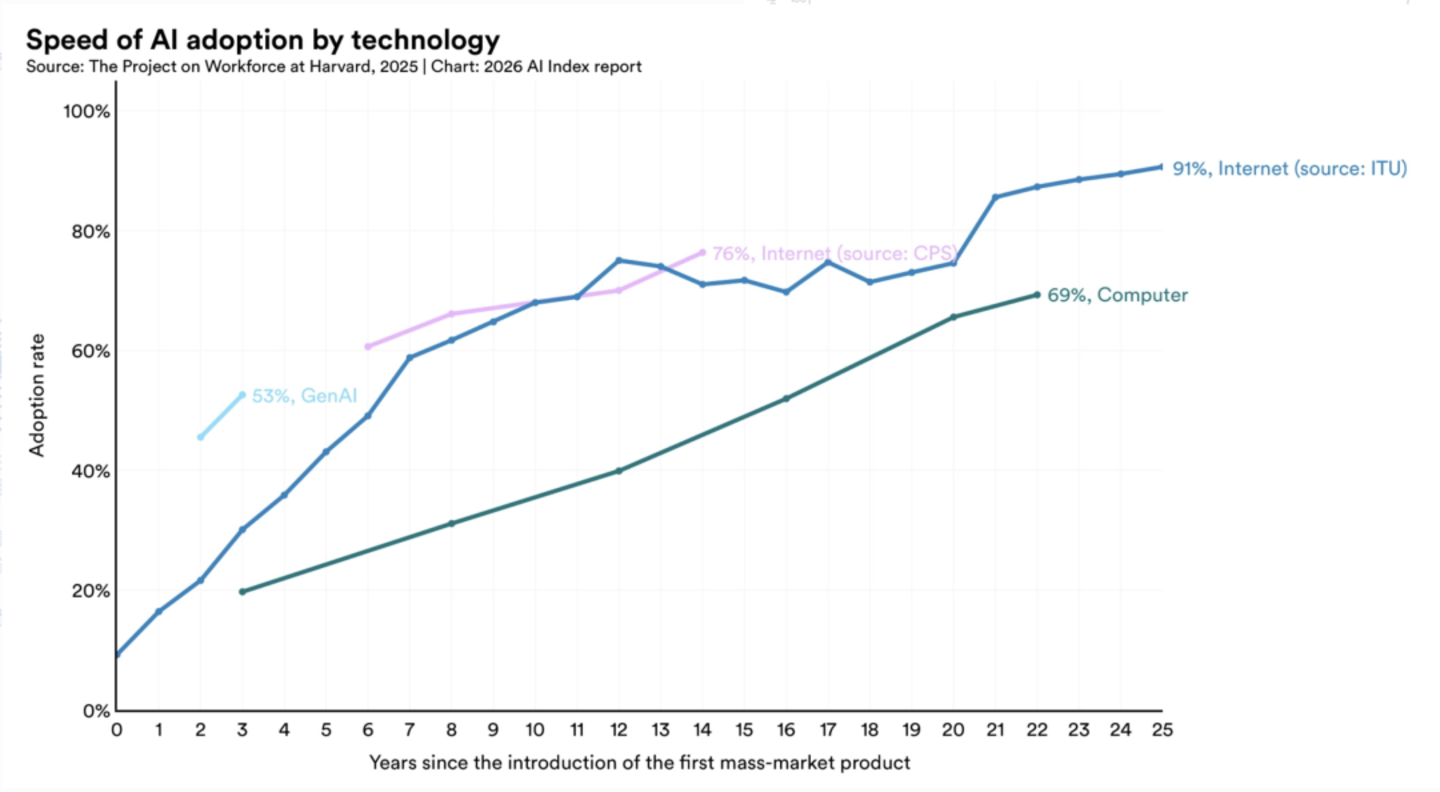 报告指出,生成式 AI 普及仅三年,全球已有超过半数人口使用生成式 AI,其普及速度甚至超过了个人电脑和互联网。