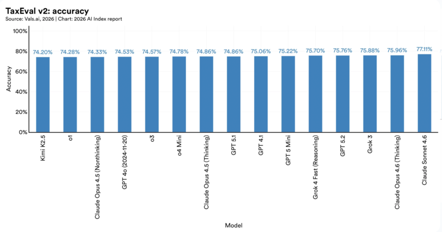 其中在 TaxEval v2 准确率当中,国内的 Kimi K2.5 排名第一,达 74.2% 的准确率,高于 OpenAI 和 Anthropic 研发的一众模型。