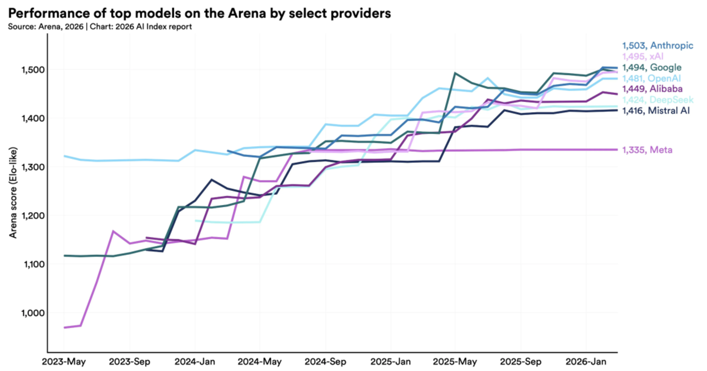 截至 2026 年 3 月,Anthropic 领先,xAI、谷歌和 OpenAI 紧随其后。DeepSeek 和阿里巴巴等中国模型仅略逊一筹,但美国模型仅领先 2.7%。由于排名靠前的 AI 模型之间的差距微乎其微,它们现在的竞争主要集中在成本、可靠性和实际应用价值上。