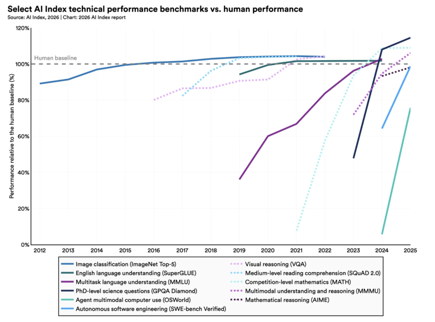 由于人工智能模型是通过处理海量文本和图像而非体验物理世界来学习的,因此人工智能表现出 「锯齿状智能」。机器人仍处于早期阶段,仅能成功完成 12% 的家务任务;AI 也在向法律和金融等专业领域拓展,但目前还没有任何一种模型能够完全主导这些领域。