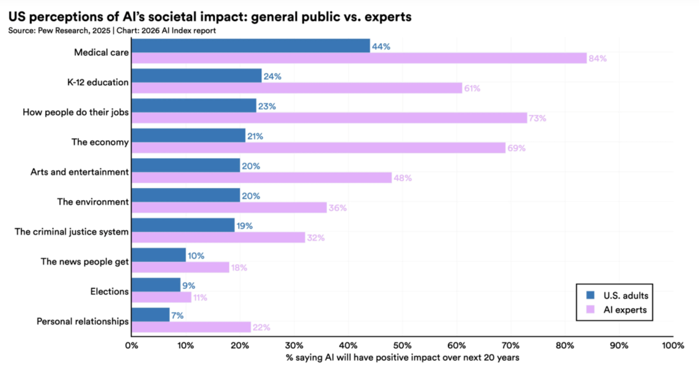 专家对 AI 在教育和医疗保健领域的影响也比公众更为乐观,但他们一致认为 AI 会对人际关系等一系列场景造成不利影响。