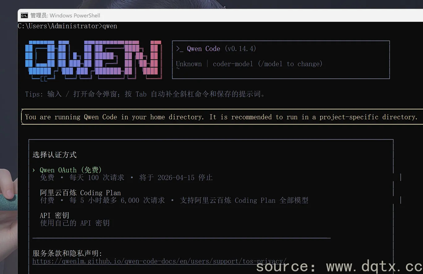 1. 首次启动会提示选择登录方式,直接选择 「Qwen OAuth」