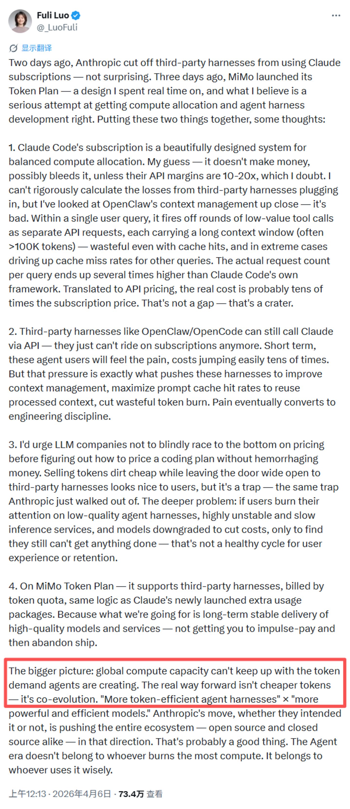 Token 经济的新竞争,已经细微到 「谁能让每一个 Token 产出更高的价值」。罗福莉在自己那篇浏览量超过 73w+的帖子最后写道,真正的出路不是更便宜的 Token,而是模型和 Agent 的协同进化。