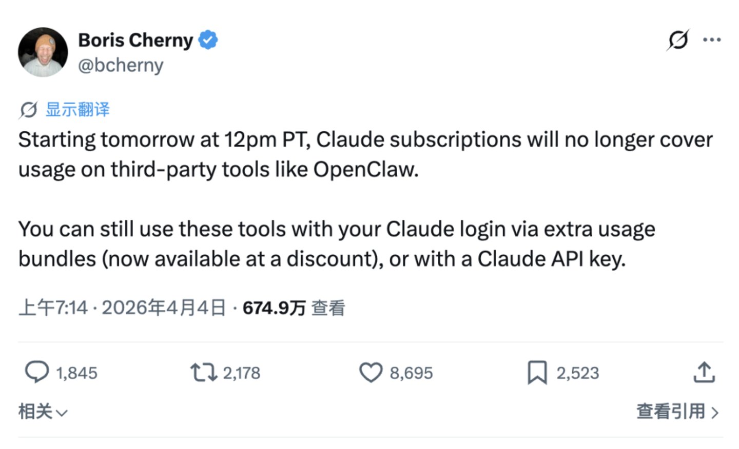 Claude Code 负责人 Boris Cherny 在 声明里说,订阅服务 「并非为这些第三方工具的使用模式而设计」。这句话没有错,但它遮住了一个更基础的问题:没有任何订阅服务能被设计成覆盖这种使用模式。Agent 场景下的 Token 消耗量没有上限,也没有历史数据可以参考,任何固定月费都是在对一个无法建模的变量做猜测。