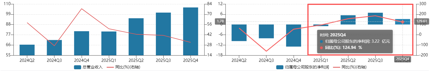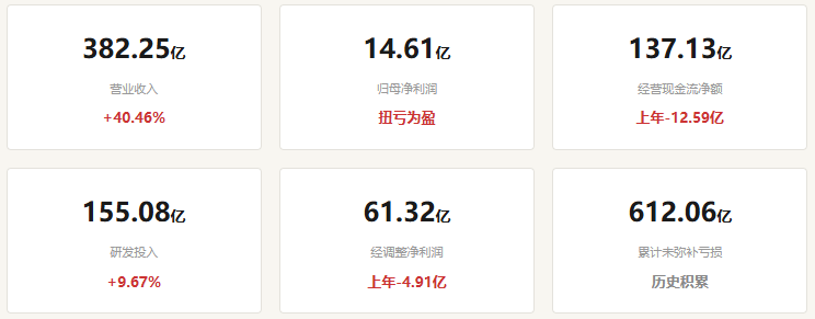 全年来看,公司实现营业收入 382.25 亿元,同比增长 40.46%,延续稳健高增态势;归母净利润 14.61 亿元,相较于 2024 年净亏损 49.78 亿元,正式实现扭亏为盈,这也是公司自成立以来首次全年盈利。