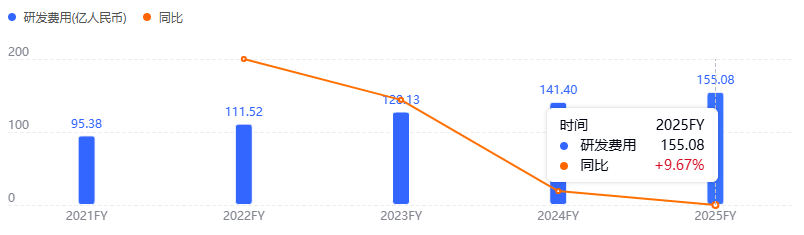 经营杠杆效应也开始集中显现。2025 年公司研发投入 155.08 亿元,同比仅增长 9.67%,研发费用率从 2024 年的 51.96% 降至 40.57%。这是一个关键的结构性信号,创新药企的盈利弹性,通常在收入增速大幅超越费用增速时集中释放。