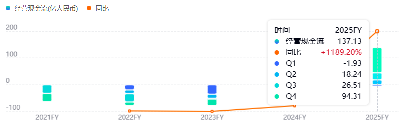 经营现金流同样扎实。2025 年,公司经营活动产生的现金流量净额达 137.13 亿元,而 2024 年与 2023 年分别为净流出 12.59 亿元和 77.93 亿元。