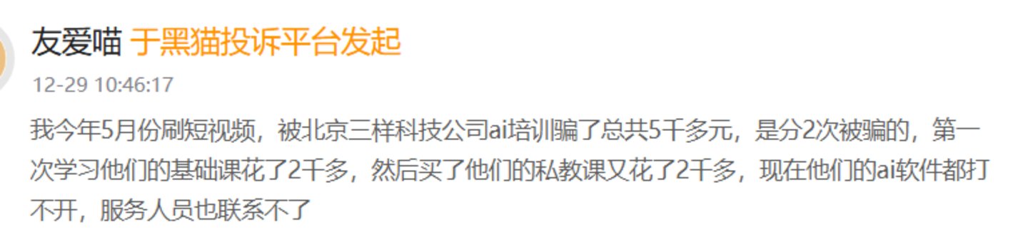 「我今年 5 月份刷短视频,被北京三样科技公司 ai 培训骗了总共 5 千多元,是分 2 次被骗的,第一次学习他们的基础课花了 2 千多,然后买了他们的私教课又花了 2 千多,现在他们的 ai 软件都打不开,服务人员也联系不了」