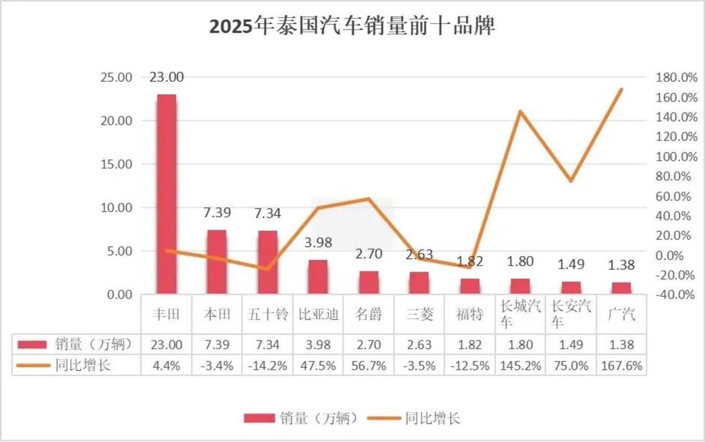 从数据来看,日系车衰落、中国汽车崛起的变化趋势在一些国家已经出现。以东南亚为例,一直以来,东南亚都被视作日本汽车的 「后花园」,比如泰国,以前九成以上的市场被日系车占据。而根据 2025 年的销量情况,日系车的市场占有率跌破 70% 关口,降至 68.4%,较此前大幅缩水,相反,比亚迪、名爵、长城等我国汽车品牌的增长势头惊人。