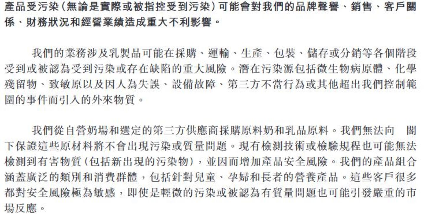 其招股书中也坦言产品会面临 「产品受污染」 的风险——公司业务涉及乳制品可能在采购、运输、生产、包装、储存或分销等各个阶段受到或被受到污染或存在缺陷的重大风险。同时,在原材料层面,公司坦言,无法保证这些原材料将不会出现污染或质量问题。