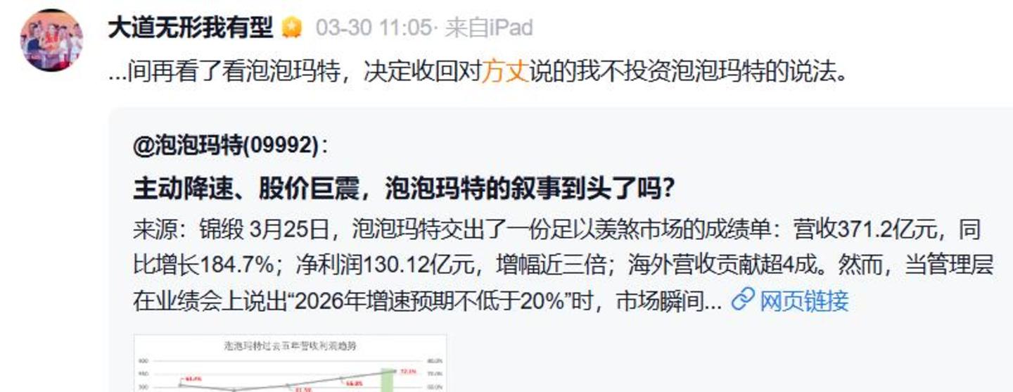 3 月 30 日,段永平在雪球发帖称:「这两天花时间再看了看泡泡玛特,决定收回对方丈 (雪球创始人、董事长方三文) 说的我不投资泡泡玛特的说法」。