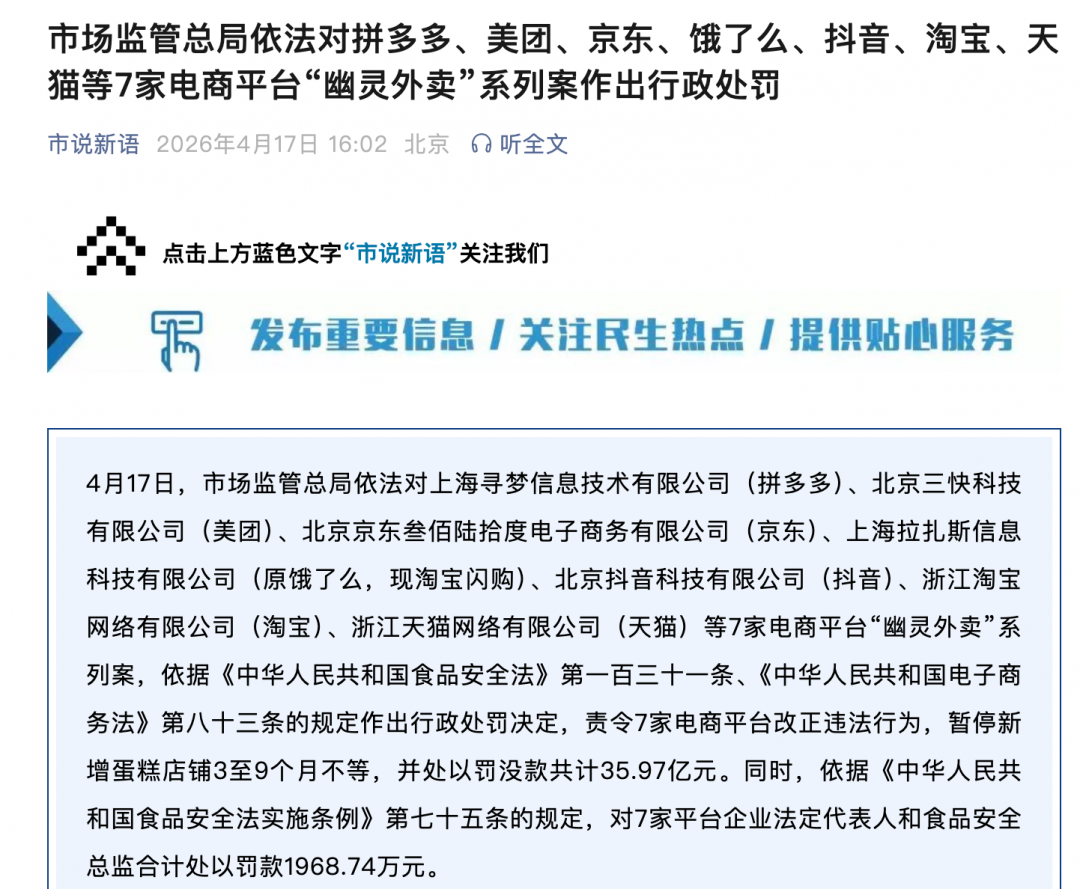【TechWeb】4 月 17 日消息,据国家市场监管总局官方公众号消息,今天,市场监管总局依法对上海寻梦信息技术有限公司 (拼多多)、北京三快科技有限公司 (美团)、北京京东叁佰陆拾度电子商务有限公司 (京东)、上海拉扎斯信息科技有限公司 (原饿了么,现淘宝闪购)、北京抖音科技有限公司 (抖音)、浙江淘宝网络有限公司 (淘宝)、浙江天猫网络有限公司 (天猫) 等 7 家电商平台 「幽灵外卖」 系列案,依据 《中华人民共和国食品安全法》 第一百三十一条、《中华人民共和国电子商务法》 第八十三条的规定作出行政处罚决定,责令 7 家电商平台改正违法行为,暂停新增蛋糕店铺 3 至 9 个月不等,并处以罚没款共计 35.97 亿元。