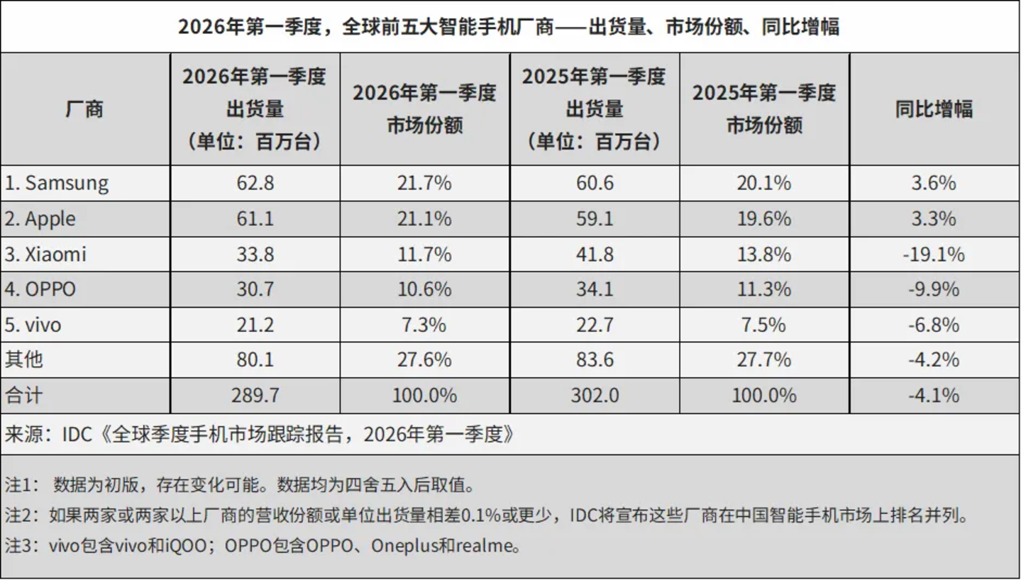 全球市场同样在洗牌。IDC 数据显示,2026 年第一季度全球智能手机出货 2.897 亿部,同比下滑 4.1%,这是自 2023 年年中以来全球大盘首次下跌。三星重回全球第一 (6280 万台);苹果第二 (6110 万台),小米保住了第三的位置 (3380 万台),但它 19.1% 的同比跌幅也是全球前五中最大的。OPPO 和 vivo 分列四、五名。