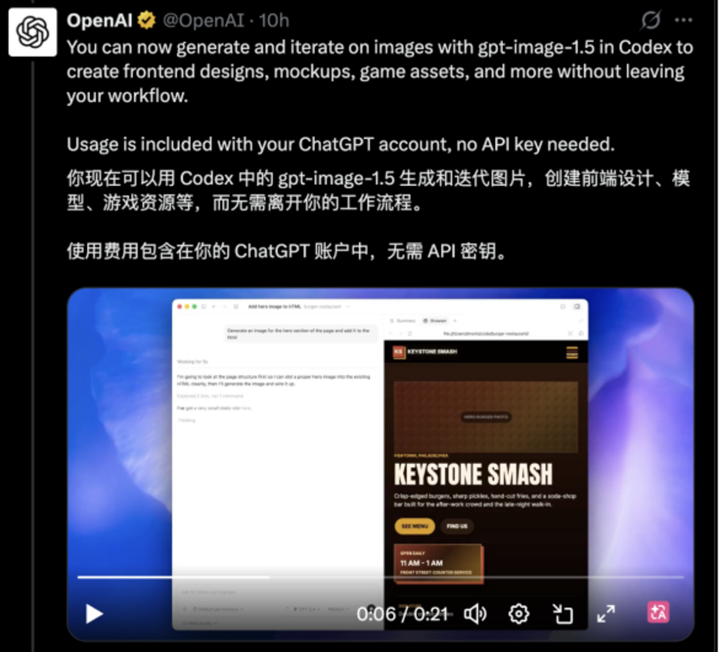 官方文档显示,他们计划随着时间推移扩展这一功能,使 Codex 能更完整地控制浏览器,不再局限于本地运行的网页应用。