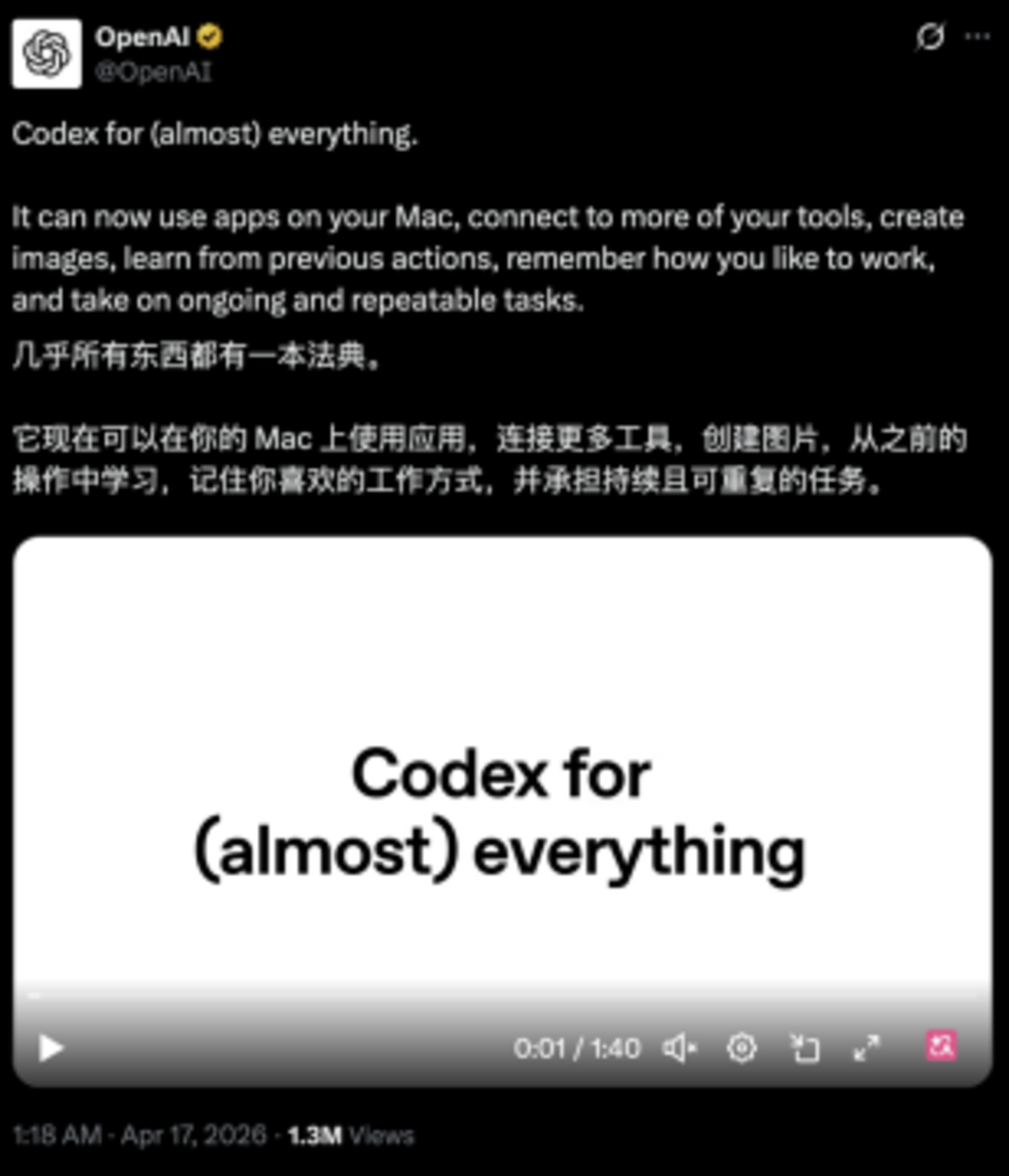 能力还在铺开,但方向已经很明确了:Codex 正在从一个写代码的工具,变成一个可以跨应用、跨时间持续完成任务的系统。