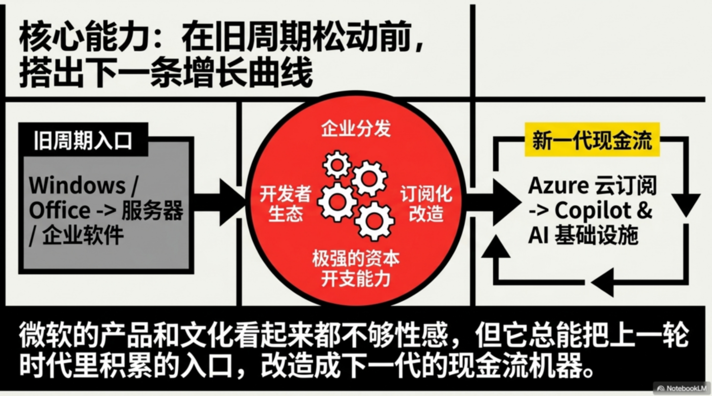 微软的产品和文化看起来都不够性感,它只是比绝大多数巨头更擅长在旧周期松动之前,就把下一条增长曲线搭出来。