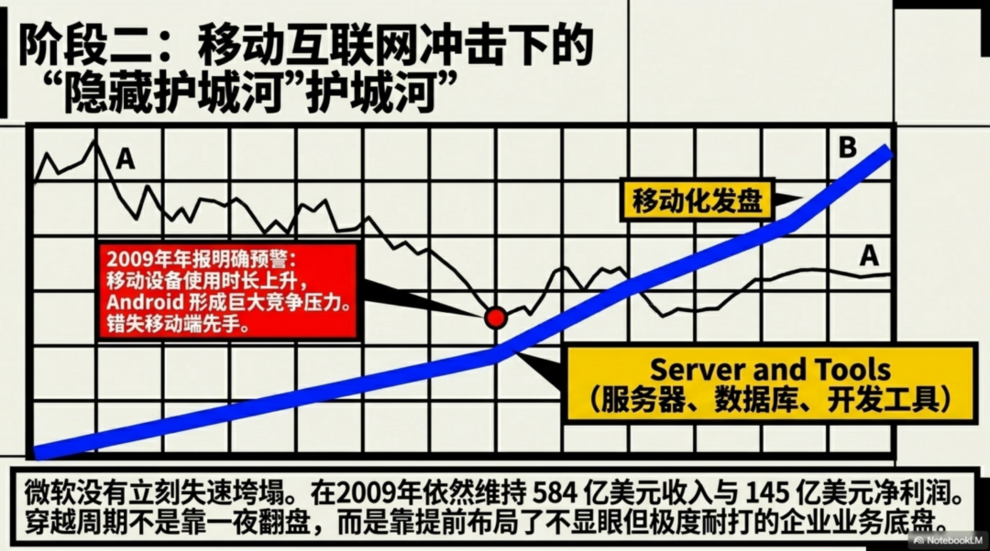 但就在这个时候,微软并没有因为 Windows 面临挑战而立刻失速,一个重要原因是它早已长出 Server and Tools 这条 「第二曲线」——服务器、数据库、开发工具、企业服务这些看起来没那么性感的业务,给它撑住了收入和利润,也给后来的云转型争取了时间。