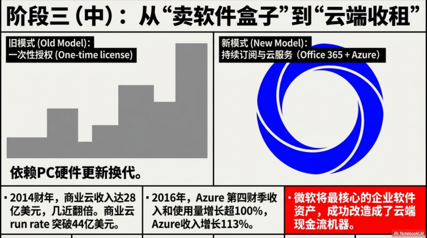 这个数字放到今天当然不算大,但它的意义在于微软开始把自己最核心的企业软件资产,从一次性授权,改造成持续订阅和云服务。