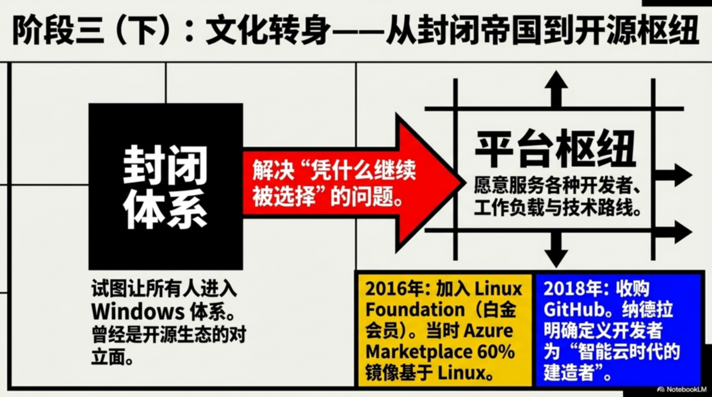 把加入 Linux Foundation 和收购 GitHub 连起来看,微软完成的其实是一次更深的转型:从一个试图让别人进入自己体系的公司,变成一个愿意服务各种开发者、各种工作负载、各种技术路线的平台公司。Azure 后来之所以能真正长大,背后不只是销售能力和资本开支,更是这种平台心态的变化。