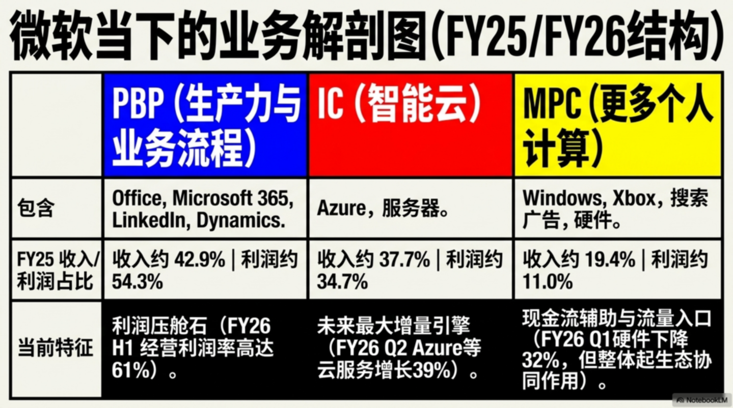 按 FY2025 全年看,微软三大分部分别是:PBP(生产力与业务流程) 收入 1208 亿美元、经营利润 698 亿美元;IC(智能云) 收入 1063 亿美元、经营利润 446 亿美元;MPC(更多个人计算) 收入 546 亿美元、经营利润 142 亿美元。粗算下来,收入占比约为 42.9% / 37.7% / 19.4%,经营利润占比约为 54.3% / 34.7% / 11.0%。