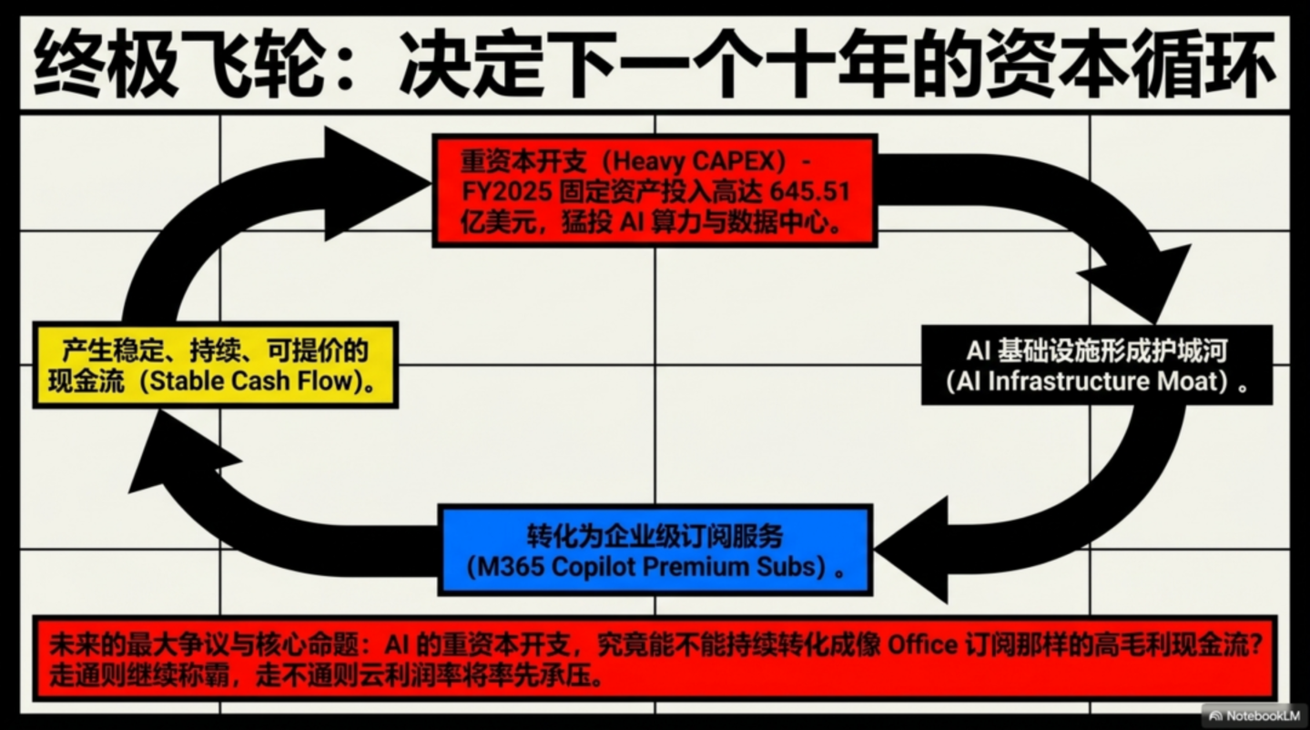 对微软来说,未来的关键在于,「能不能把 AI 的重资本开支,转成像 Office 订阅那样稳定、持续、可提价的现金流」。如果这一步走通,微软还会继续穿越下一轮周期;走不通,压力会先体现在云利润率上。
