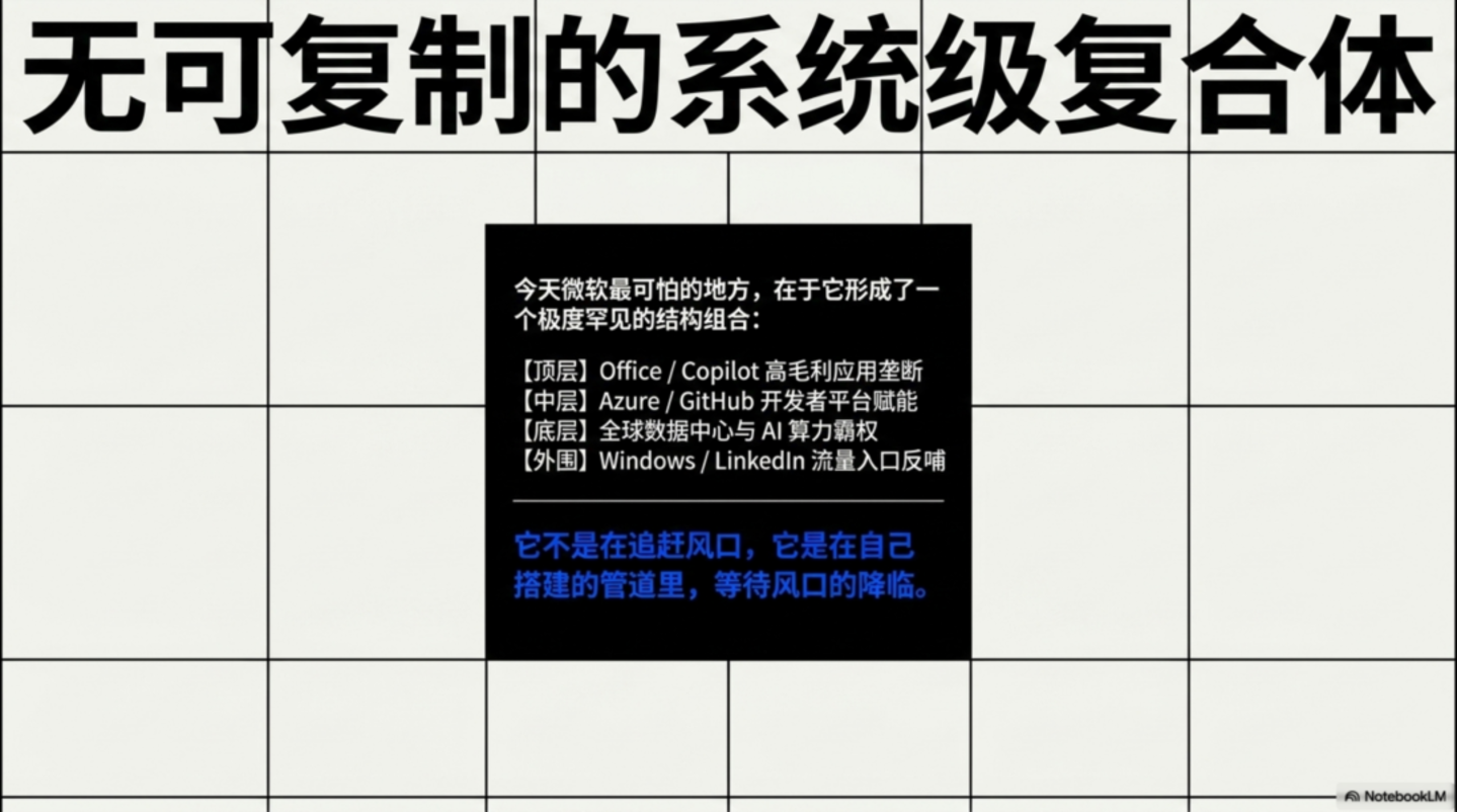 微软这家公司今天最厉害的地方,在于它已经形成了一个很少见的组合:上面是 Office/Copilot 这种高毛利应用层,中间是 Azure/GitHub/开发工具这类平台层,下面是数据中心和 AI 基础设施;同时它还有 Windows、LinkedIn、Dynamics、搜索、游戏这些流量和场景入口。