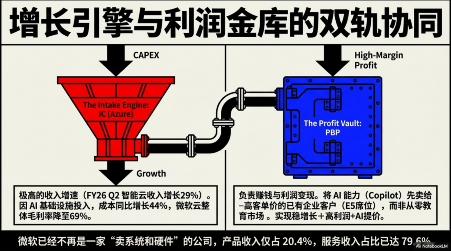也就是说,微软最赚钱的并不是 Azure,而是 Office/微软 365/LinkedIn/Dynamics 这一整套企业办公与业务软件资产;Azure 是增长引擎,但 PBP 仍是利润压舱石。