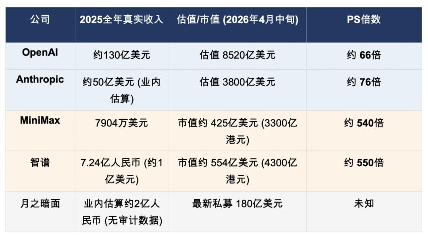 把它推到这个位置的,不是它自己,是身边那两家已经上市的同行。智谱 1 月 8 日敲钟,MiniMax 1 月 9 日敲钟,到四月中旬,智谱涨了近 700%,MiniMax 涨了 480%。按 2025 年全年真实收入算,两家的市销率高达 540 到 550 倍,是 OpenAI(66 倍) 和 Anthropic(76 倍) 的七到八倍。