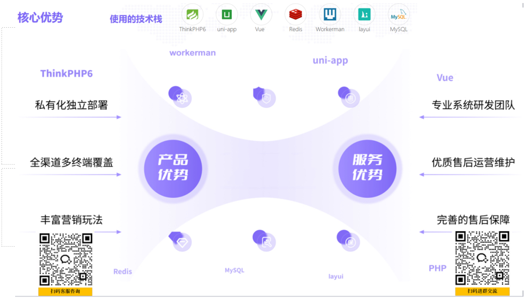 ● 系统基于 TP6+Uni-app 框架开发;客户移动端采用 uni-app 开发,管理后台 TH6 开发。