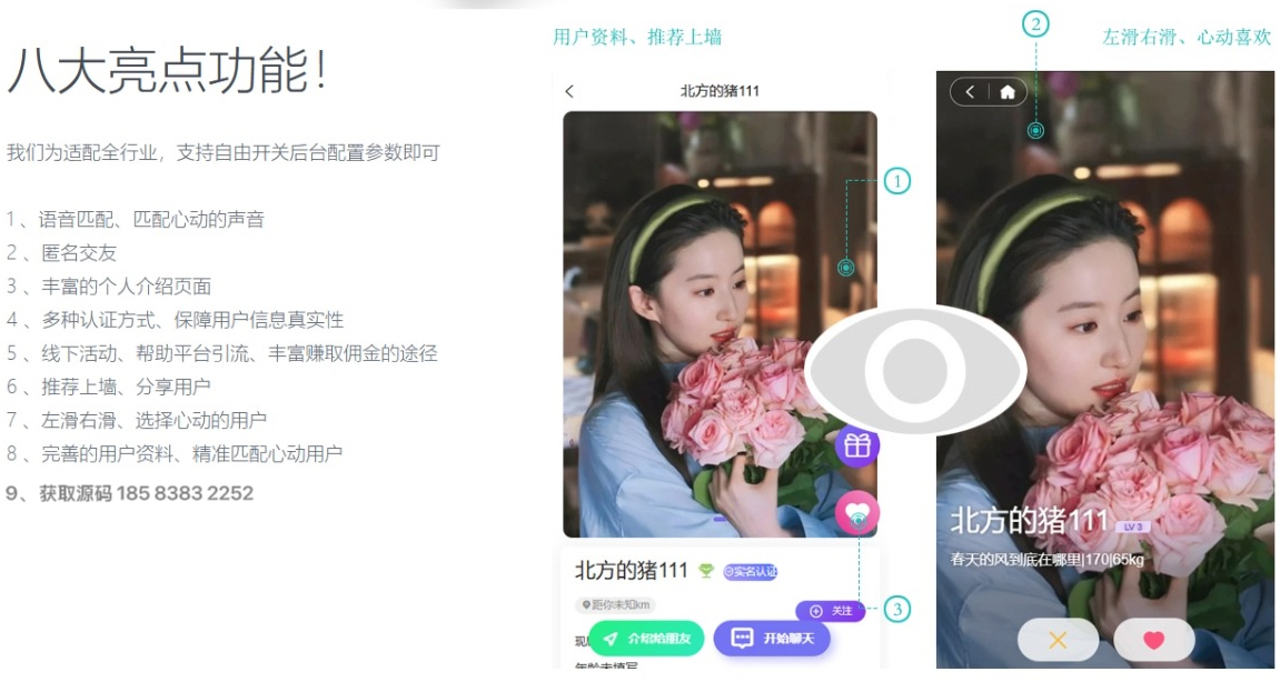 1、婚恋板块:主要目的是婚恋,认证系统 (实名认证、面部识别活体本人检测、学历证明、工资收入证明),搭载媒婆推广系统 + 红娘 CRM 管理系统 + 门店加盟系统、让征婚相亲不在难。
