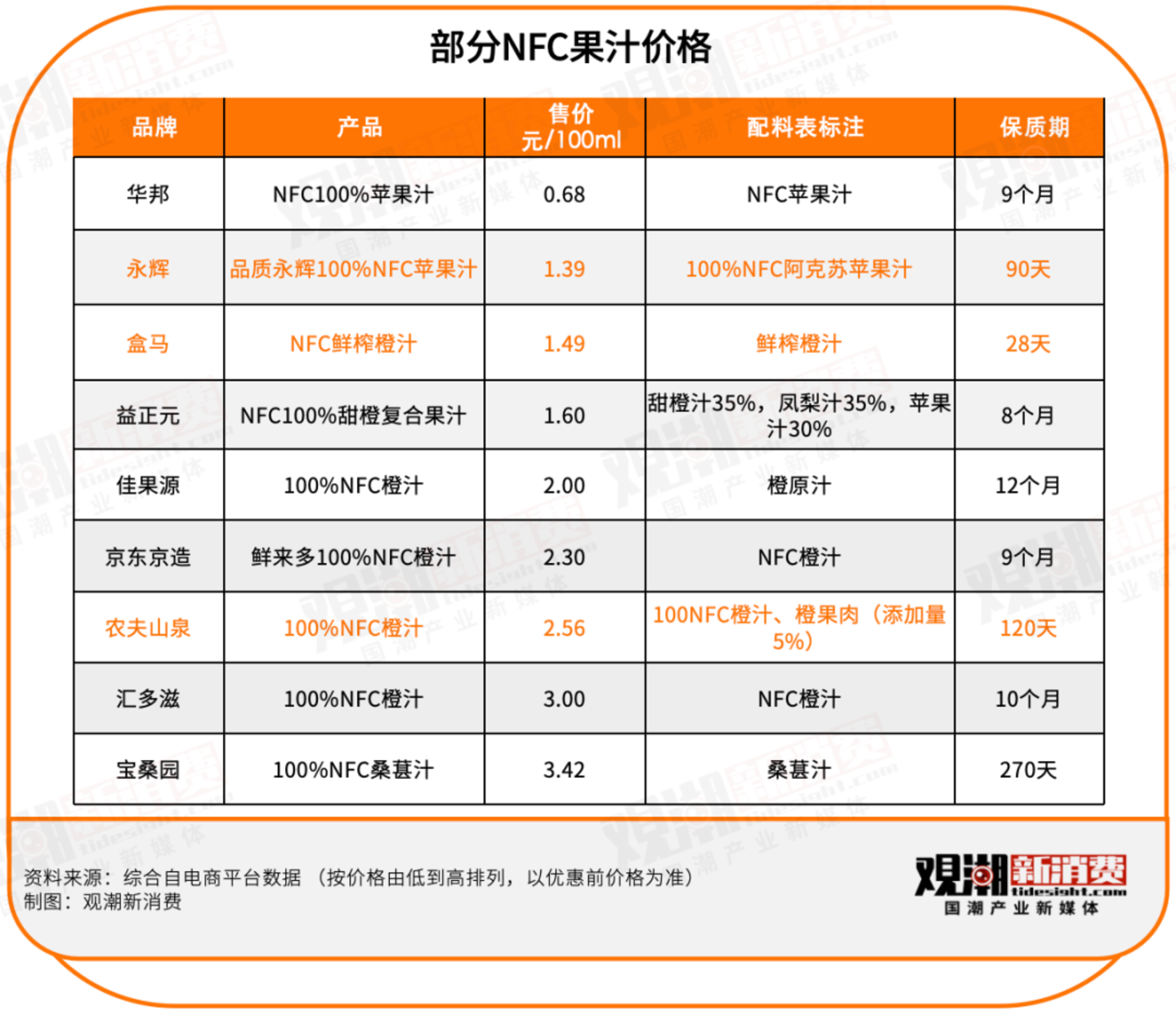 日前北冰洋一款标注添加 NFC 果汁的葡萄复合果汁,配料表显示 NFC 葡萄汁添加量为 0.005%,遭到网友 「一盒只加一滴果汁」 的嘲讽;零食品牌 「好想来」 旗下 「好想来甄选」100% 橙汁仅有 8.5% 的 NFC 果汁添加量,却在包装上标注了大大的 「NFC 非浓缩还原」 字样,客观上对消费者造成了误导,华邦、养乐兹等品牌也均存在类似问题;还有的混淆 「100% 果汁」 和 「100% NFC 果汁」 的概念,让消费者花高价买到普通浓缩汁。