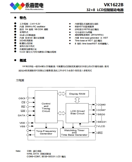 2 特点 VK1622S-1 32×8 LCD 显示驱动芯片 Rev.1.3 16-July-2024 1/32