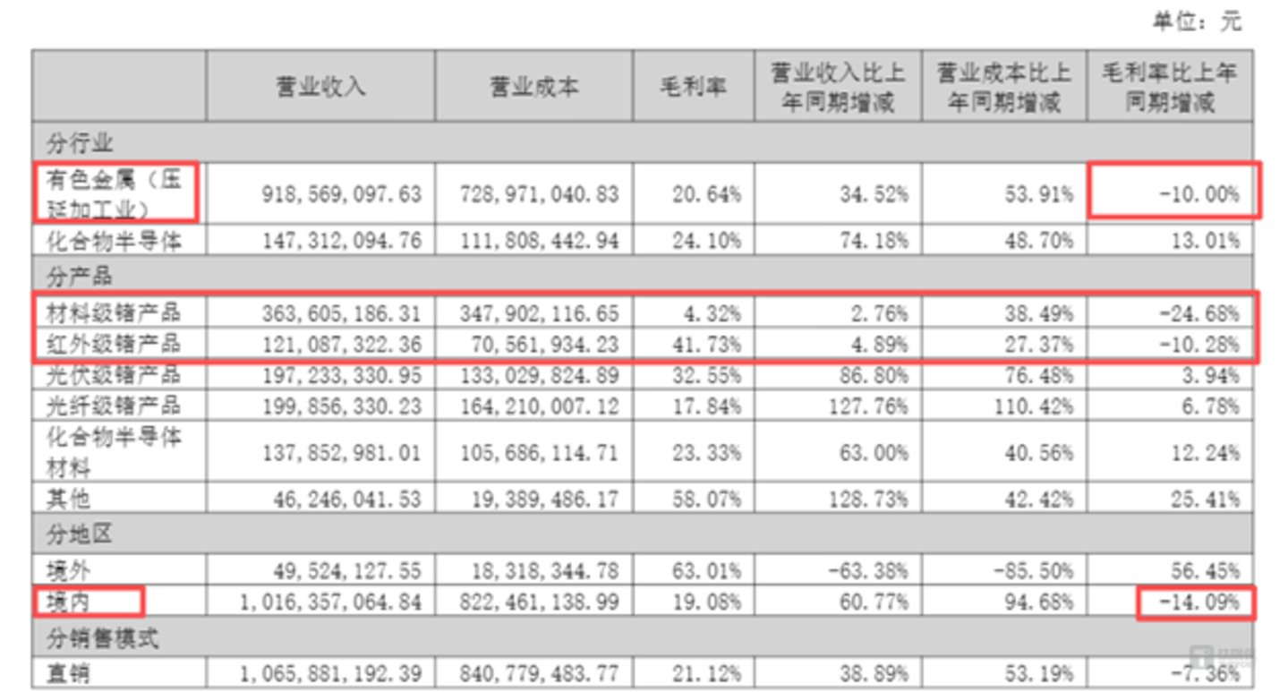 产品端,虽然材料级锗锭、光伏级锗晶片、光纤级四氯化锗等产品价格也有所提升,但单位售价涨幅显著低于单位成本涨幅,综合毛利率下滑明显。