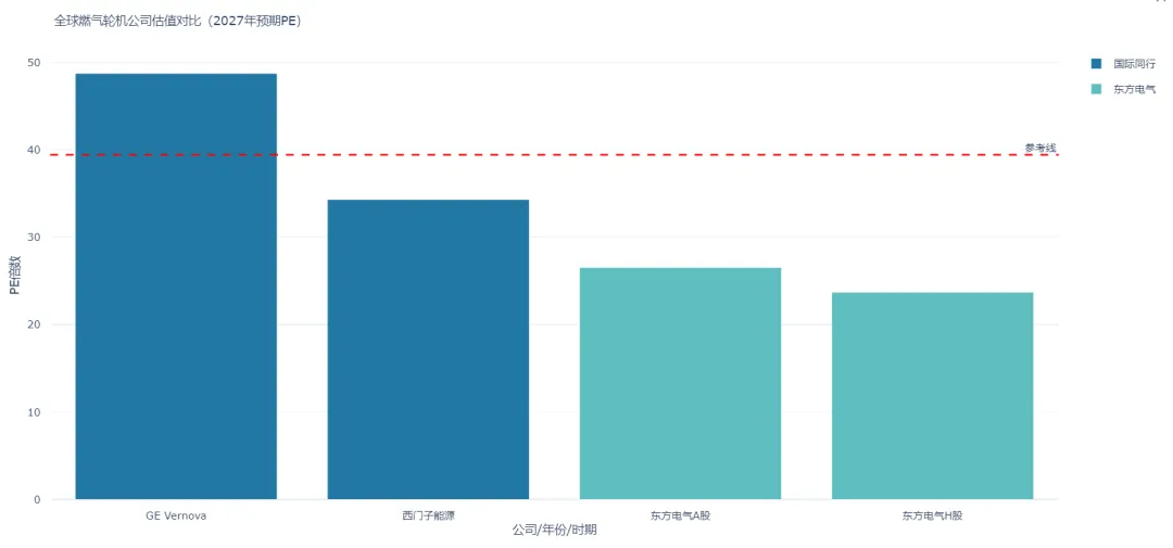GE Vernova 的 2027 年预期 PE 为 48.74 倍,较板块平均溢价超过 20%。西门子能源为 34.30 倍。而东方电气 A 股 2027 年预期 PE 为 26.53 倍,H 股为 23.70 倍,较全球板块平均分别折价 33% 和 40%。