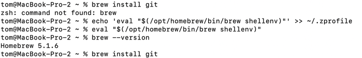 如果提示 「zsh: command not found: brew」 报错则执行下面两行修复 PATH(让 brew 命令能被找到):
