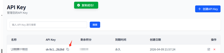 7. 创建 APi key:点击 API Key 栏目,创建后复制 (可以设置额度,以防 key 泄露工作流出问题导致额度刷光)
