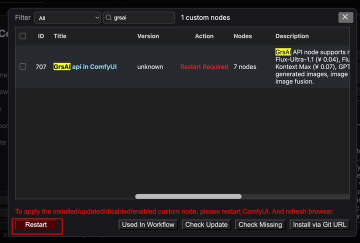 第一种:在 ComfyUI Manager 的 custom nodes Manager 里搜索 Grsai 进行安装