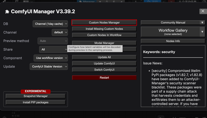 4. 安装成功后,点击 Restart 重启 Comfyui