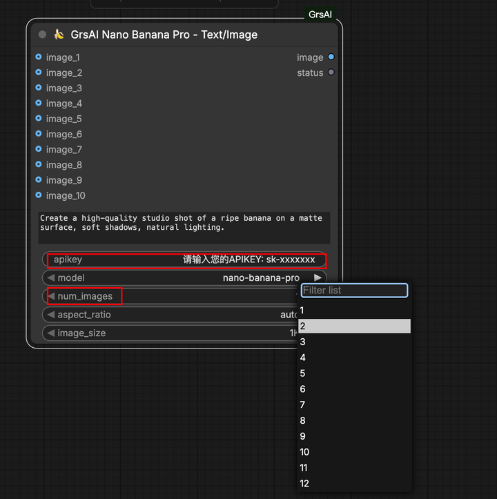 8. 在 comfyui 空白处右键,添加节点,找到 GrsAi,选择模型,黏贴刚才复制的 APikey 即可使用