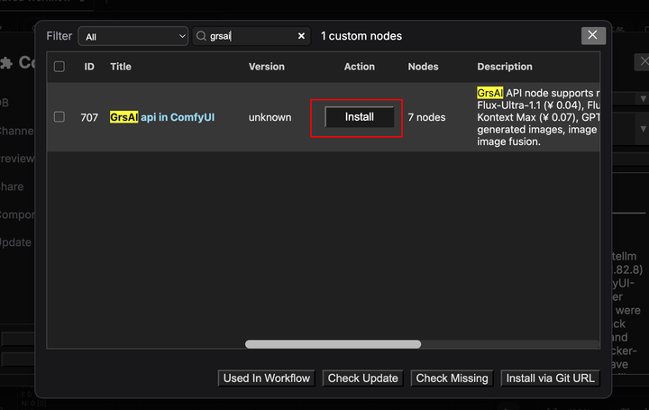 3. 输入 Grsai,找到 GrsAi api in Comfyui,点击 Install 按钮安装插件