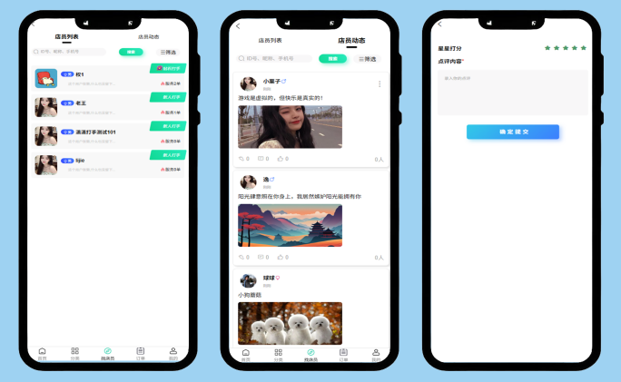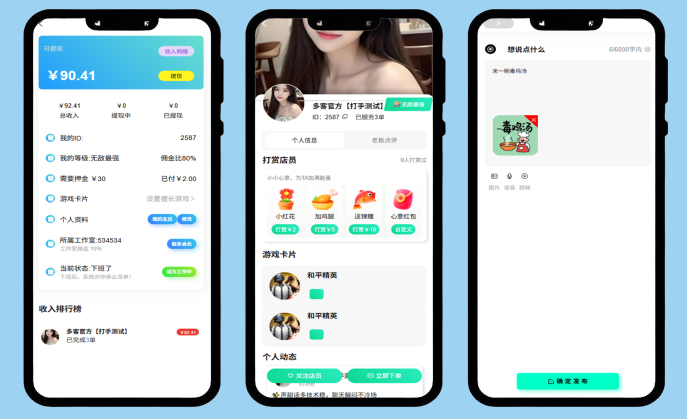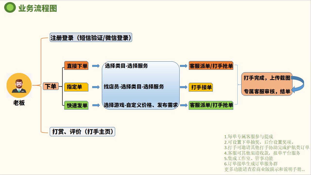 ● 多端适配:老板用小程序下单,打手可用 APP 接单 (推送更及时),客服用 PC 后台管理