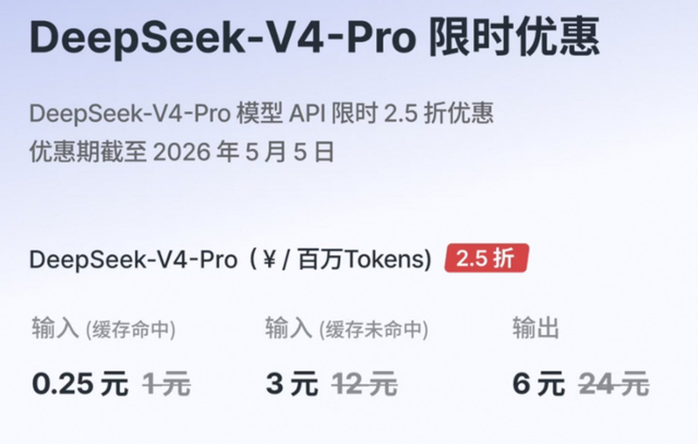 DeepSeek 给出了它的回应:从现在开始,1M 上下文将是 DeepSeek 所有官方服务的标配。同时,在价格上继续保持了极强的压迫感, V4-Flash 输入 (缓存命中) 打到了 0.2 元/百万 tokens,V4-Pro 限时优惠输入 (缓存命中) 低至 0.25 元/百万 tokens;预计下半年昇腾 950 批量上市后,Pro 价格还会大幅下调。