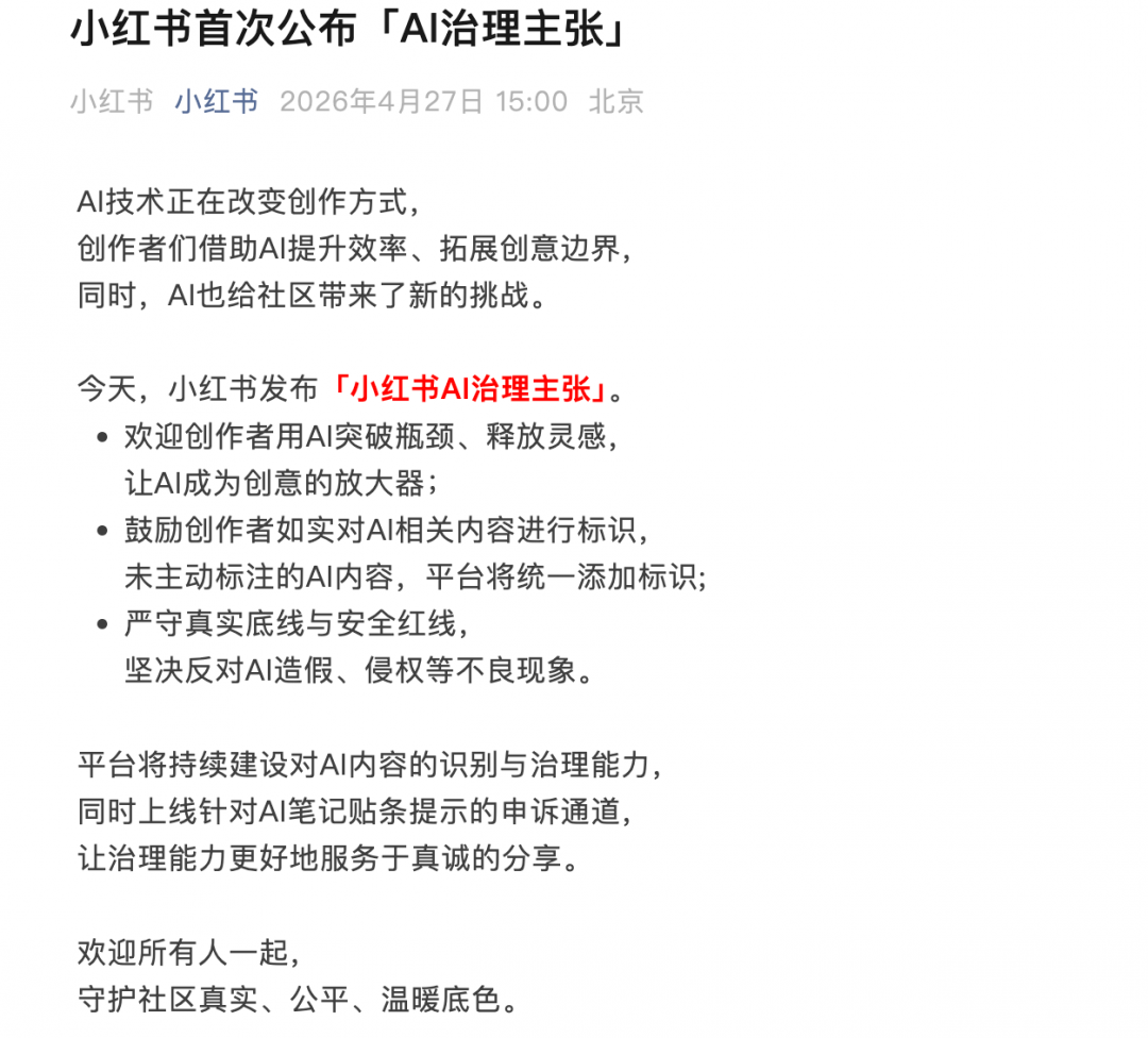 小红书表示,创作者应当在笔记中如实标识 AI 内容。无论是完全由 AI 生成,还是经 AI 润色的再创作,均建议在发布时主动声明。对于未主动标注的 AI 内容,平台识别后将统一添加标识;同时上线申诉通道,供创作者对标识结果提出异议。
